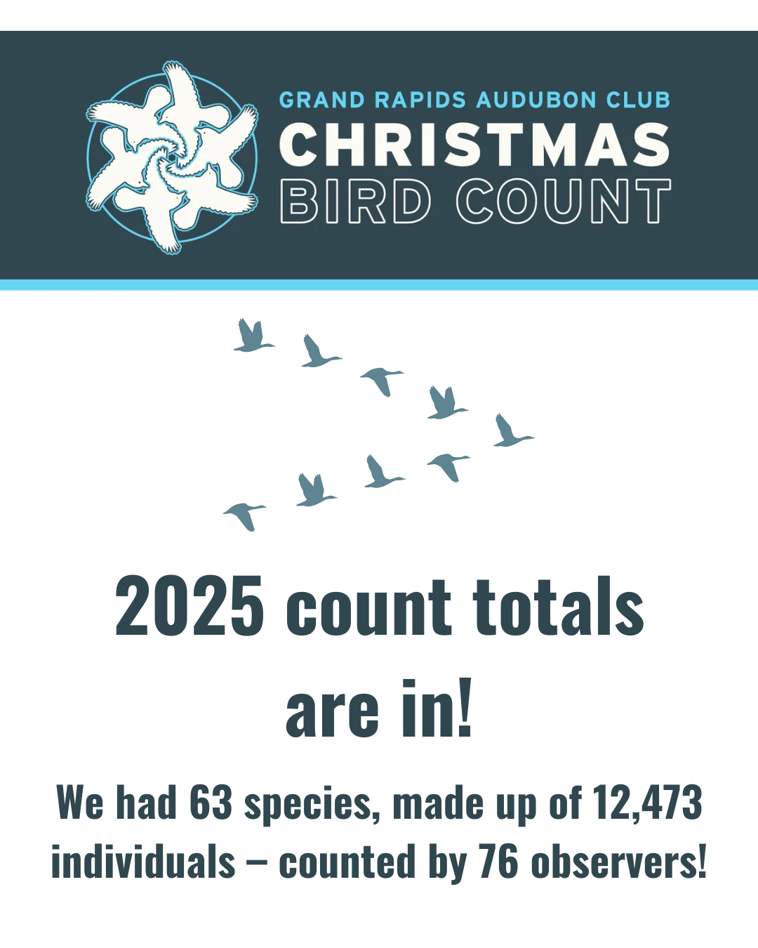 This year’s December 27th count started and ended like last year’s December 28th count: a very mild and a dry day. This year, however, the mild weather still left bodies of water mostly frozen, not wide open like last year. This meant waterfowl was restricted to less open water and easier for the observers to find and count birds, producing better numbers. Highlights on this year’s 126th count are a large flock of Trumpeter Swans, a large number of Cedar Waxwings, a Hermit Thrush, and a Northern Shrike. Last year’s 66 species, with 1 count-week-only species and 9746 individuals set high standards. After results from the first 3 of 7 areas reporting, this year’s count day total stands at 48 species so far with Northern Shrike in Area A‘s Roselle Park a count-week-only bird. Last year our count produced hotspot-level numbers, which we are hoping to match with this year’s results. Also, we are very grateful for the good turnout this year – initial indications are that the number of participants will eclipse last year’s total of 51 counters. See the February 2026 edition of the Caller for a report on species!Stay tuned - information on the 66th Annual Grand Rapids Audubon Club Christmas Bird Count is forthcoming!